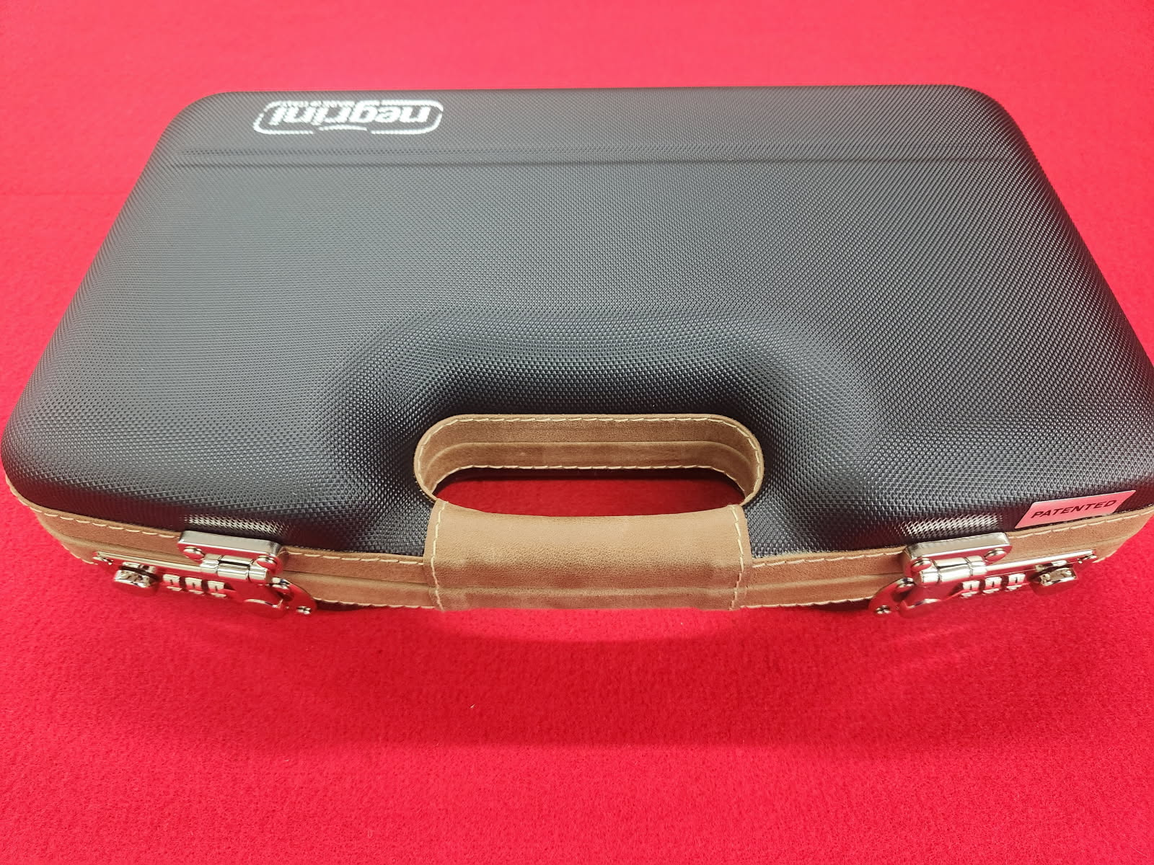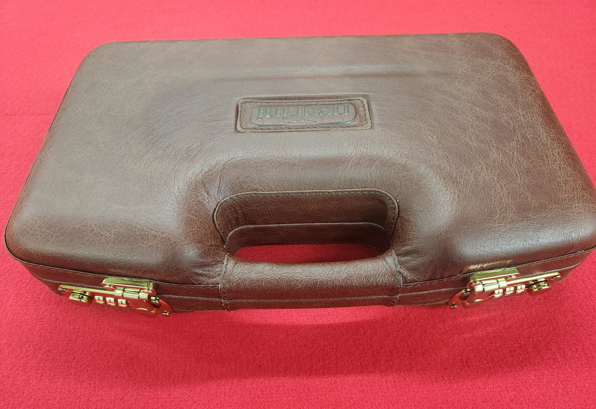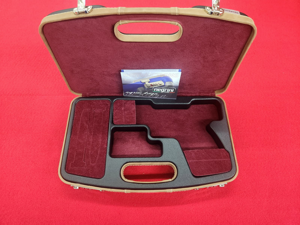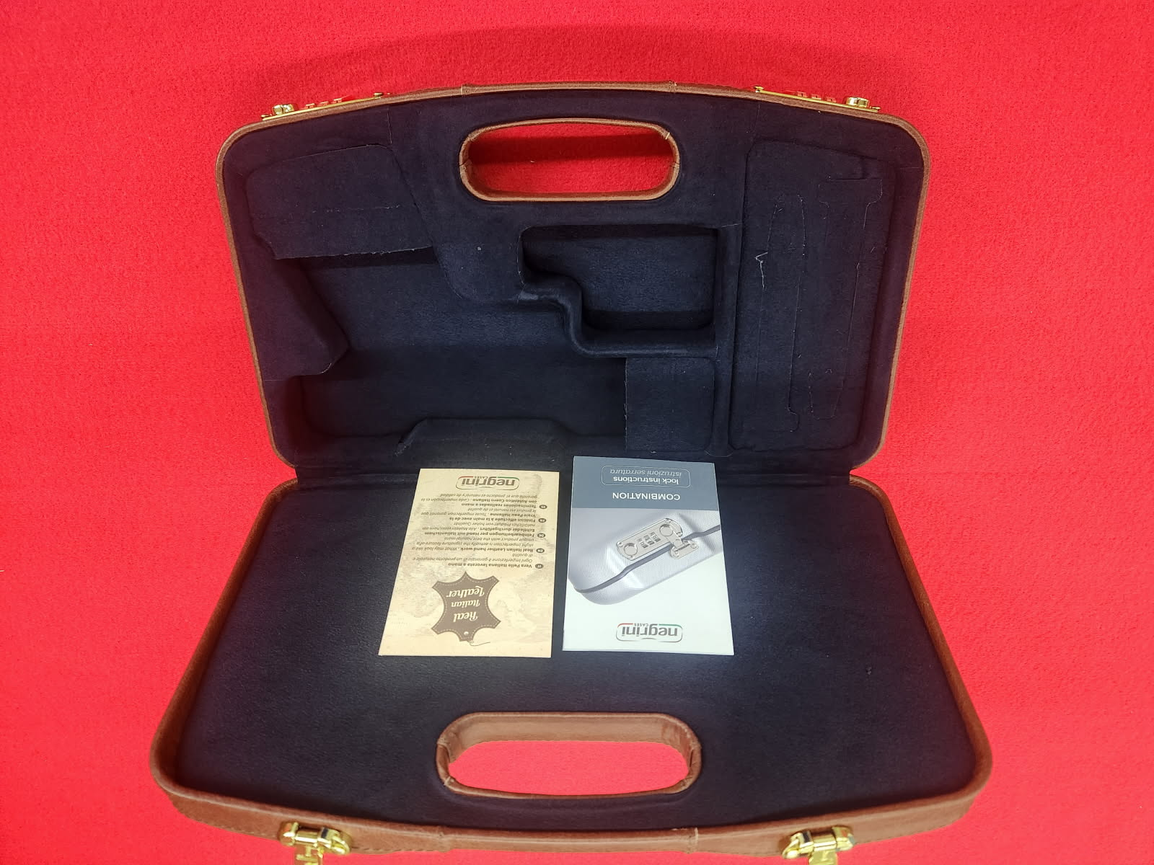 Super deluxe trim with all Italian leather outer, locking semi-auto pistol/handgun case.